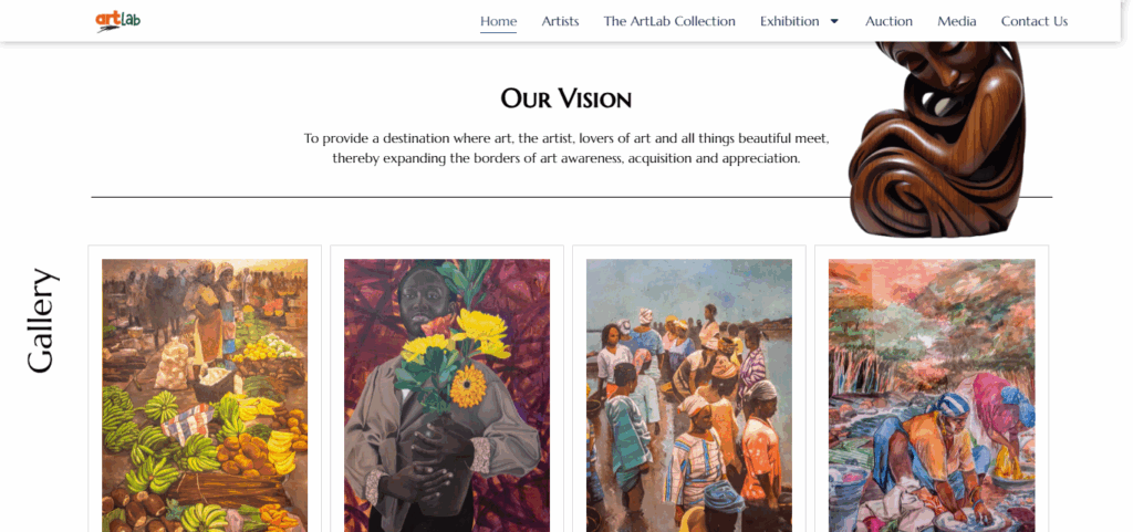 Arts Lab Gallery is a contemporary art space committed to showcasing exceptional artworks from emerging and established artists across Africa and beyond. Known for its forward-thinking exhibitions and community-focused art programs, Arts Lab Gallery needed a digital platform that would reflect its artistic identity while serving as a hub for discovery, engagement, and art sales.